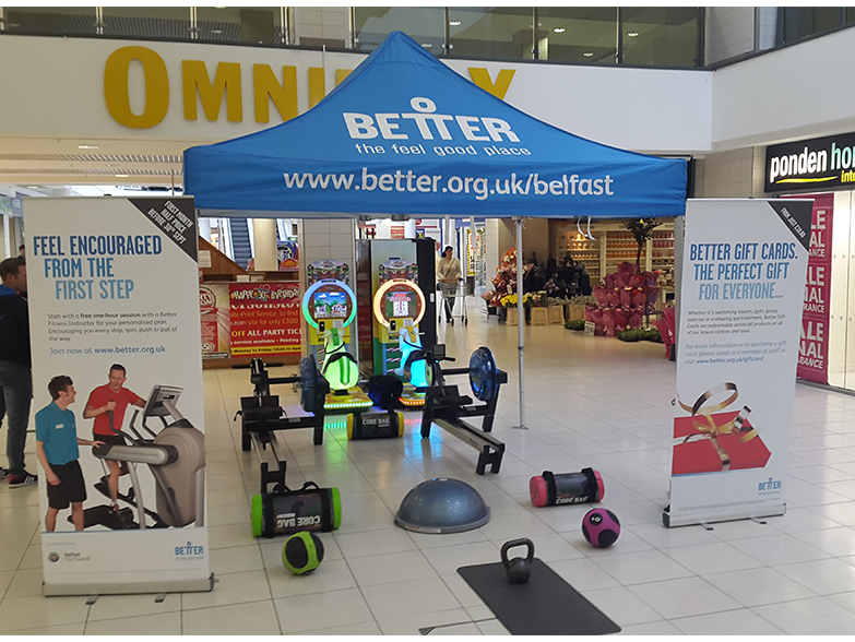 These photos show Our Pro 50 frame and printed roller banners promoting their new centre in Belfast. Although this is being used indoors, the reason they keep coming back to us is because they know the Pro 50 frame is just as suitable outside one of their busy centres throughout the cold and wetter months!