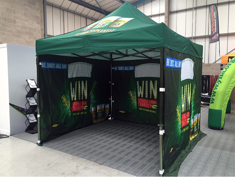 World famous Pot Noodle recerntly approached Instant Promotion to produce a number of 3m x 3m Instant Awnings with full colour dye sublimation printing. Pot Noodle specified the green Pantone colour and we matched it to perfection using the very latest sublimation printing technology.