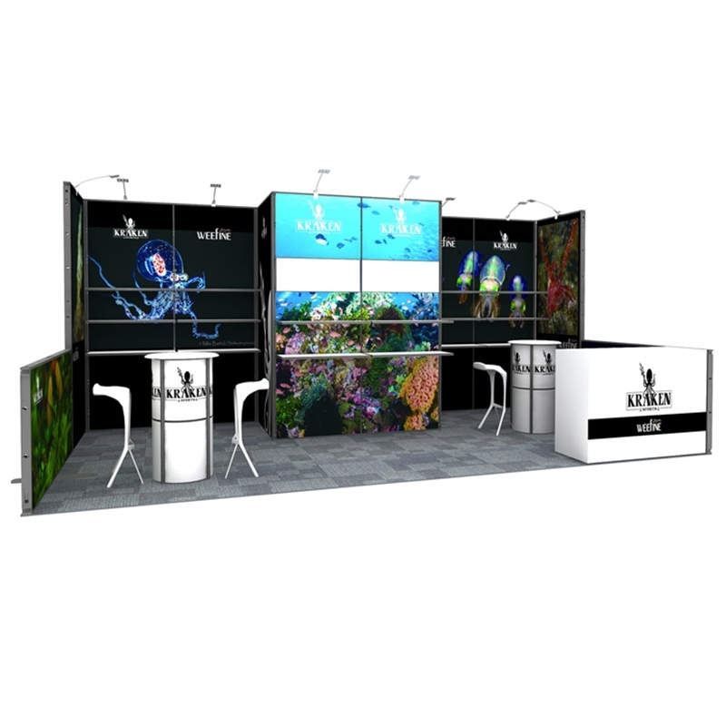 A 6m x 3m Exhibition stand consisting of a 6m back wall 2 x 3m return. The 3m returns consist of a 1m full height panel and a 2m half height panel. Located centrally on the 6m back wall is a 2m x 1m storage room. Seamless stretch fabric graphics applied to the front of the 6m wall 3m with double sided graphics on the 3m returns, providing privacy and extra branding. Optional LED lighting attached to the top of the frames illuminates the graphics and makes you stand out from the crowd! Add an optional counter with a seamless graphic wrap as a focal point to interact with customers.