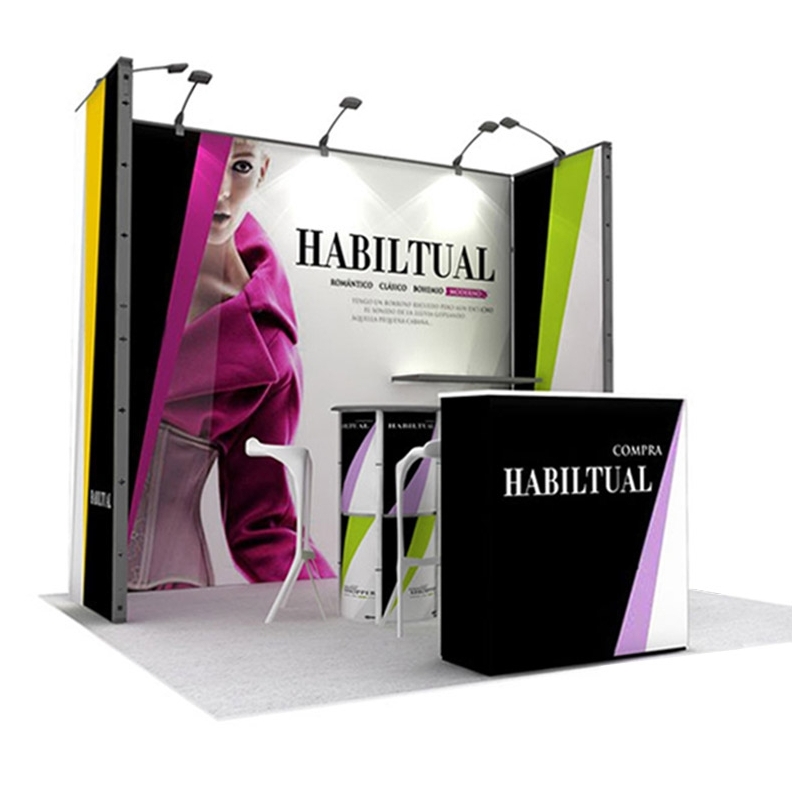 A 3m back wall with two 1m returns. Seamless stretch fabric graphics applied to the front of the 3m walls and double sided graphics on the 1m returns, providing privacy and extra branding. Optional LED lighting attached to the top of the frames illuminates the graphics and makes you stand out from the crowd! Add an optional counter with a seamless graphic wrap as a focal point to interact with customers.
