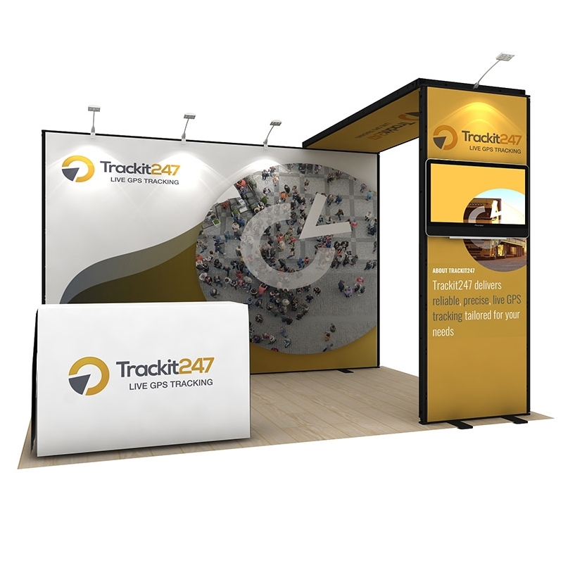 A 4m back wall with a bridge to add that extra dimension. Seamless stretch fabric graphics applied to the front of the 4m wall and double-sided graphics on the 1m bridging unit, make it great for space only stands. Optional LED lighting attached to the top of the frames illuminates the graphics and makes you stand out from the crowd! Add an optional counter with a seamless graphic wrap as a focal point to interact with customers.